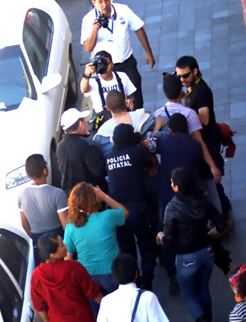 2: “Cuando un periodista empieza a tomar las fotografías nos sueltan. Otro policía recibe la orden y arremeten: ¿cómo no?, sí los vamos a chingar. Nos llevan a madrazos. Nos suben a las camionetas, nos golpean en los testículos, en el rostro. (…) En ningún momento nos dijeron por qué se nos detenía. Cuando estábamos a punto de salir nos dicen que por el bando de policía y buen gobierno ellos pueden detenernos cuando quiera”.